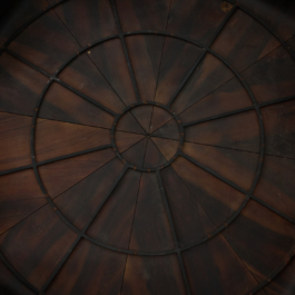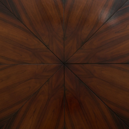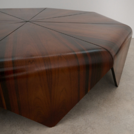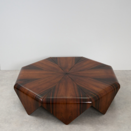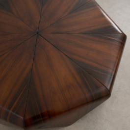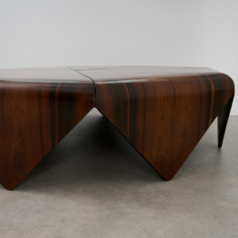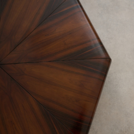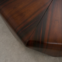 This large coffee table showcases the beautiful grain of the Jacaranda and its remarkable dark flames, converging elegantly at the center. The wood has been fully refinished and is in very good condition, revealing a warm, deep tone that highlights its fine craftsmanship.