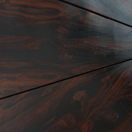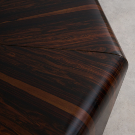 This coffee table showcases the beautiful Jacaranda grain, with dark and light streaks running across the entire tabletop. The tabletop has been refinished and is in good condition, giving it a warm, rich tone that highlights the quality of Zalszupin’s work.