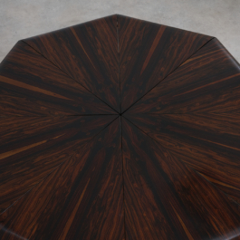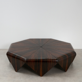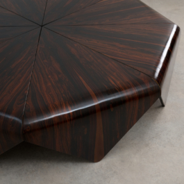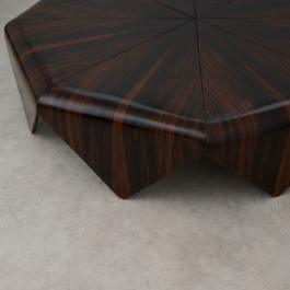 Beautiful and rare 'Petalas' coffee table, designed by Jorge Zalszupin and produced by his own company, L’Atelier, Brazil, 1959. The Petalas table was inspired by the folded paper forms of origami. It is composed of eight petal-shaped panels of layered Jacaranda set on a circular metal frame, together forming an elegant octagonal shape.