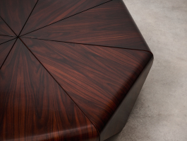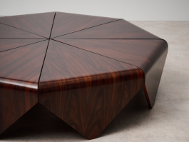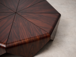 Beautiful and rare 'Petalas' coffee table, designed by Jorge Zalszupin and produced by his own company, L’Atelier, Brazil, 1959. The Petalas table was inspired by the folded paper forms of origami. It is composed of eight petal-shaped panels of layered Jacaranda set on a circular metal frame, together forming an elegant octagonal shape.