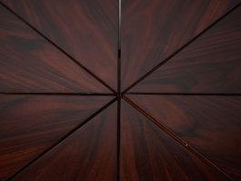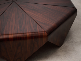 This large coffee table features the natural beauty of Jacaranda wood, with its distinctive dark grain patterns. The surface has been refinished, giving it a warm, rich tone and a smooth finish.