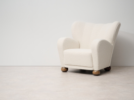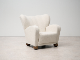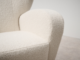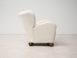 A wonderful and iconic "Aulanko" lounge chair, designed by Märta Blomstedt in the 1940s for Hotel Aulanko, Hämeenlinna, Finland. This example has been reupholstered in soft, 'Pure New Wool', making it one of the most comfortable chairs you’ll ever sink into. Part of the reason for its growing demand in recent years is just how incredibly easy it is to sit, sleep, or lounge in. In Finland, it’s even nicknamed "Laiskanlinna," which translates to "lazy castle." A truly remarkable piece of history, design, comfort, and timeless style all in one.