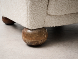 Great condition overall, reupholstered in 100% 'Pure New Wool'. The wooden legs show signs of wear consistent with age and use.
