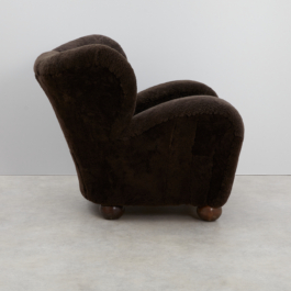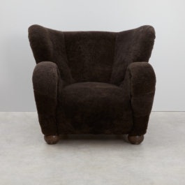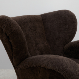 A wonderful and iconic "Aulanko" lounge chair, designed by Märta Blomstedt in the 1940s for Hotel Aulanko, Hämeenlinna, Finland. This example has been reupholstered in soft brown sheepskin, making it one of the most comfortable chairs you’ll ever sink into. Part of the reason for its growing demand in recent years is just how incredibly easy it is to sit, sleep, or lounge in. In Finland, it’s even nicknamed "Laiskanlinna," which translates to "lazy castle." A truly remarkable piece of history, design, comfort, and timeless style all in one.