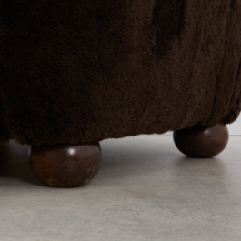 Good vintage condition overall, reupholstered in brown sheepskin. The wooden legs show signs of wear consistent with age and use.