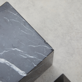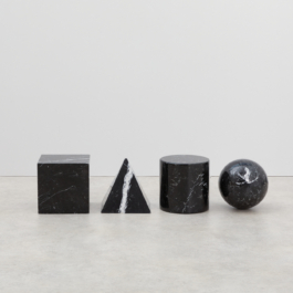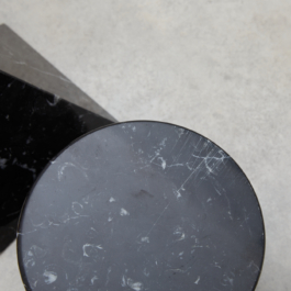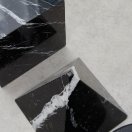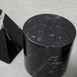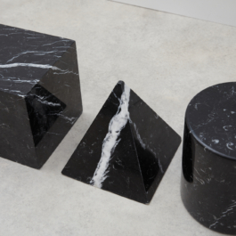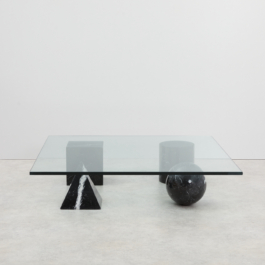 The Metafora coffee table is a beautifully crafted piece designed by Lella & Massimo Vignelli. It features a thick glass surface supported by four black marble elements inspired by Euclidean geometry. The cube, pyramid, cylinder, and sphere. It can be freely arranged to create a unique and customisable look.