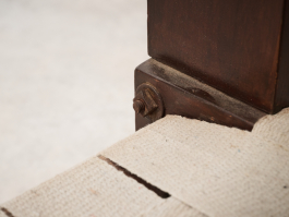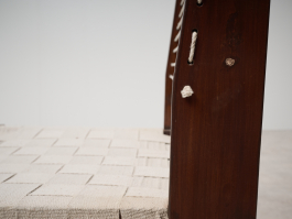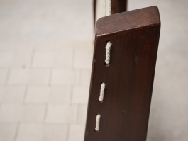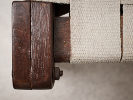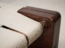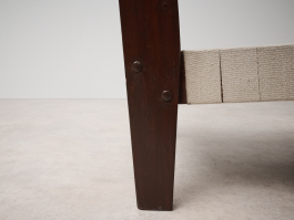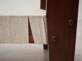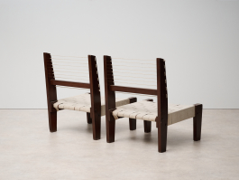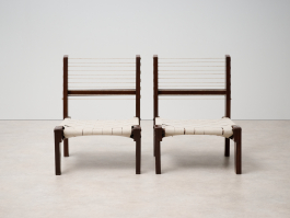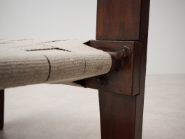 Pair of Rare Lounge Chairs by Pierre Jeanneret (1896–1967), Designed circa 1953 | Model No: PJ-SI-08-A. Crafted from solid teak, canvas, and rope, these low lounge chairs exemplify Pierre Jeanneret's early designs upon his arrival in Chandigarh. The structure, made of solid teak, can be assembled and disassembled using screws and nuts. The distinctive "bridge"-style legs support a backrest woven from cotton cord, while the seat features an interlaced pattern of broad cotton straps. With only a limited number ever produced, these chairs remain among Jeanneret’s earliest and most sought-after creations.