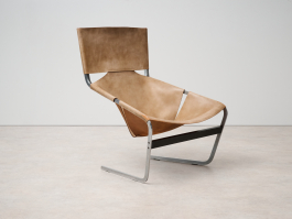 Designed by Pierre Paulin for Artifort in 1962, this cognac leather F-444 chair features sharp lines and an angled open seat that gives the illusion of floating. The combination of a metal frame and rich cognac leather creates a bold contrast and a distinctly modern look. The chair’s frame is supported by a beam structure and saddle leather.