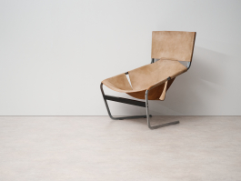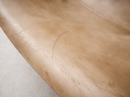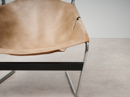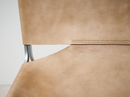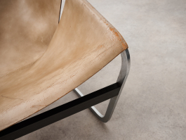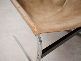 The cognac leather shows signs of age and use, developing a rich patina, particularly at the corners where it meets the frame. However, the chair remains in good condition.