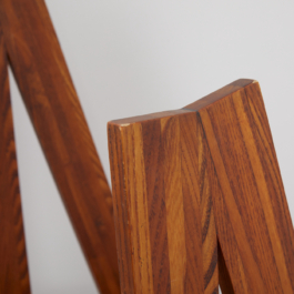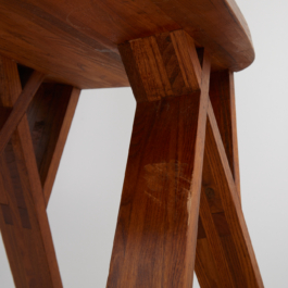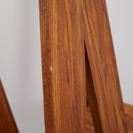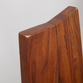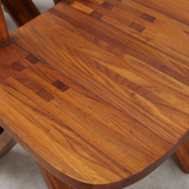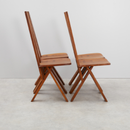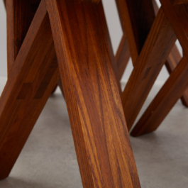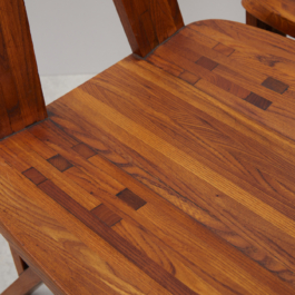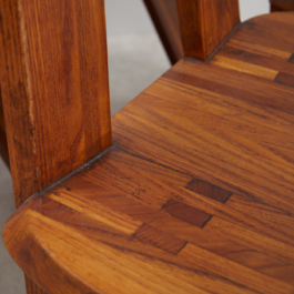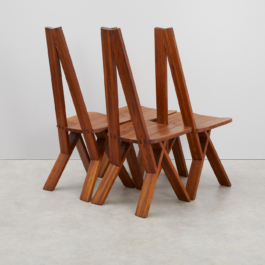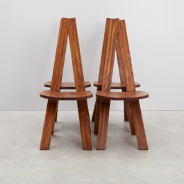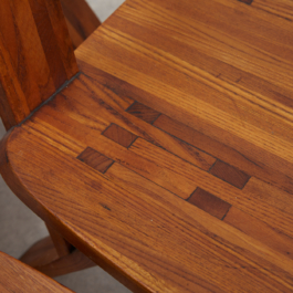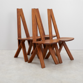 A collection of four chairs known as 'Chlacc,' part of the S45 model, designed by Pierre Chapo in 1979. The name 'Chlacc' is derived from the patented manufacturing process used to create these chairs. The S45 is one of the most sculptural and accomplished creations of Pierre Chapo's work. Their fine and light structure gives a graceful attitude to this seat, counterbalanced by the solid elm spirit.