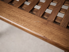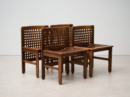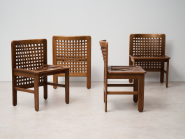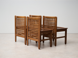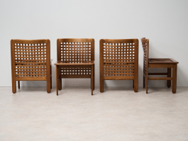 Set of four Transenna chairs by Titina Ammannati and Giampiero Vitelli for Pozzi & Verga. Designed in the late 1970s, these chairs feature sturdy seating and a wood plot backrest, making them both comfortable and visually appealing.